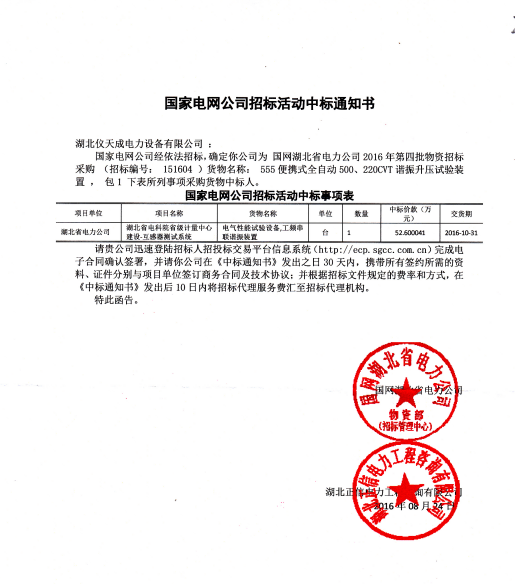 2016年9月,湖北儀天成電力設(shè)備有限公司再次捷報(bào)頻傳:我公司在國(guó)家電網(wǎng)公司的設(shè)備采購(gòu)招標(biāo)中,從眾多供應(yīng)商中脫穎而出,一舉中標(biāo)!
