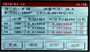 點(diǎn)擊需要修改的參數(shù)設(shè)置框設(shè)置參數(shù),全部設(shè)置完成后點(diǎn)擊“開(kāi)始”按鈕,儀器即按照設(shè)置的參數(shù)開(kāi)始自動(dòng)測(cè)量各端子的電阻值,并計(jì)算電阻率,自動(dòng)判斷接地線是否合格。