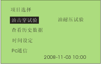 7 通過旋轉(zhuǎn)鼠標可以選擇進行擊穿試驗,耐壓試驗,查看歷史數(shù)據(jù),時間設定和PC通信等操作項目。