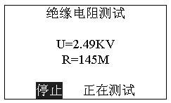 此時(shí)按確認(rèn)鍵(ENTER)進(jìn)入“正在測(cè)試”,顯示測(cè)試電壓和電阻值。