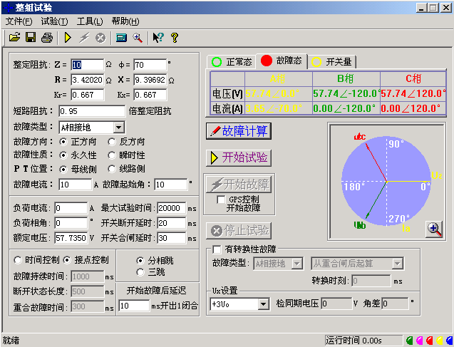 微機(jī)繼電保護(hù)測試儀整組試驗(yàn)相當(dāng)于繼電保護(hù)裝置的靜模試驗(yàn),通過設(shè)置各試驗(yàn)參數(shù),模擬各種瞬時(shí)、永久性的單相接地、相間短路或轉(zhuǎn)換性故障,以達(dá)到對距離、零序保護(hù)裝置以及重合閘的動作進(jìn)行整組試驗(yàn)或定值校驗(yàn)。下面以“整組試驗(yàn)Ⅰ”為例,簡要說明其使用方法。軟件界面如圖。