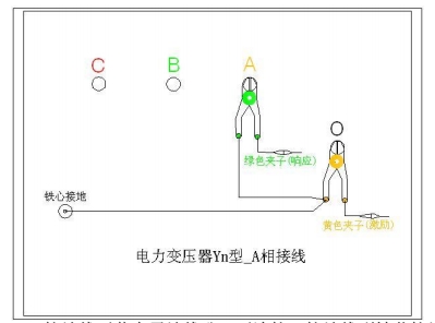 A相測(cè)量接線:1. 測(cè)量系統(tǒng)共一點(diǎn)接地,取變 壓器鐵芯接地。2. 黃夾子定義為輸入,鉗在 Yn 的‘O’點(diǎn)、綠夾子定義為測(cè)量,鉗在 A 相上。3. 地線連接網(wǎng)依次由綠夾子地線孔插入接地線至黃夾子地線孔,再連接一接地線到鐵芯接地。