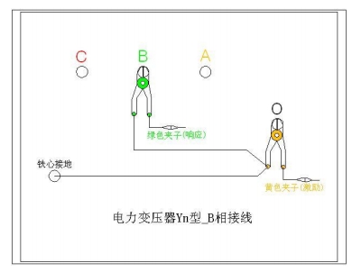 B相測(cè)量接線:1. 測(cè)量系統(tǒng)共一點(diǎn)接地,取變壓器鐵芯接地。2. 黃夾子定義為輸入,鉗在Yn 的‘O’點(diǎn)、綠夾子定義為測(cè)量,鉗在 B 相上。3. 地線連接網(wǎng)依次由綠夾子地線孔插入接地線至黃夾子地線孔,再連接一接地線到鐵芯接地。