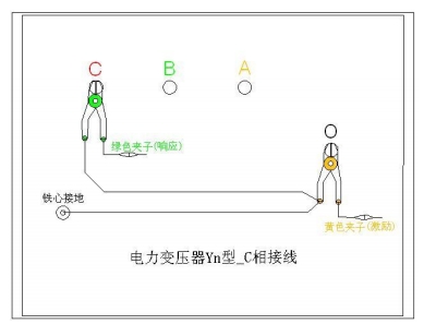 C相測(cè)量接線:1. 測(cè) 量 系 統(tǒng) 共 一 點(diǎn) 接地,取變壓器鐵芯接地。2. 黃夾子定義為輸入,鉗在 Yn 的‘O’點(diǎn)、綠夾子定義為測(cè)量,鉗在 C 相上。3. 地線連接網(wǎng)依次由綠夾子地線孔插入接地線至黃夾子地線孔,再連接一接地線到鐵芯接地。