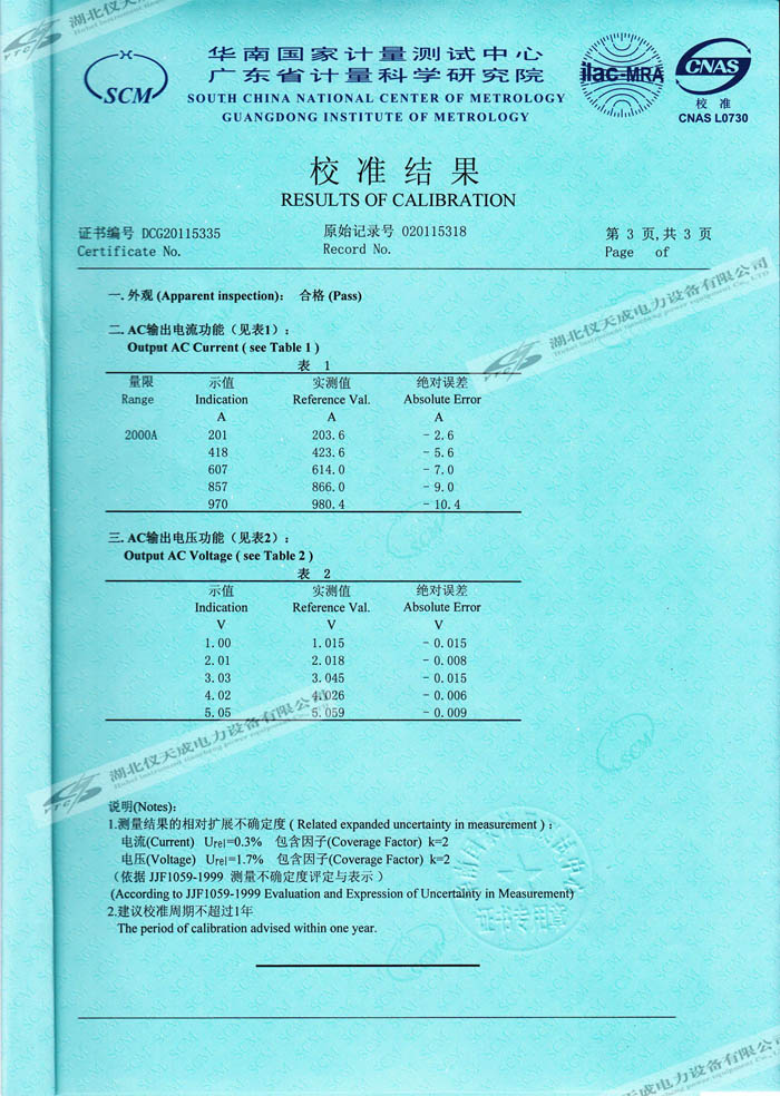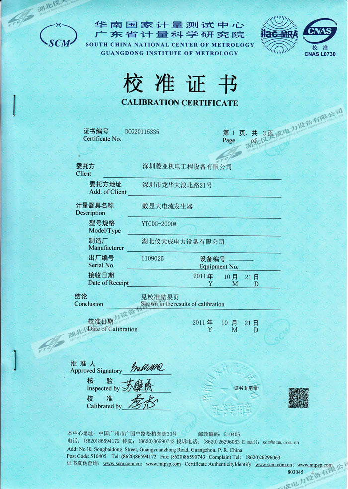 YTCDG-2000A大電流發(fā)生器的資質(zhì)證書