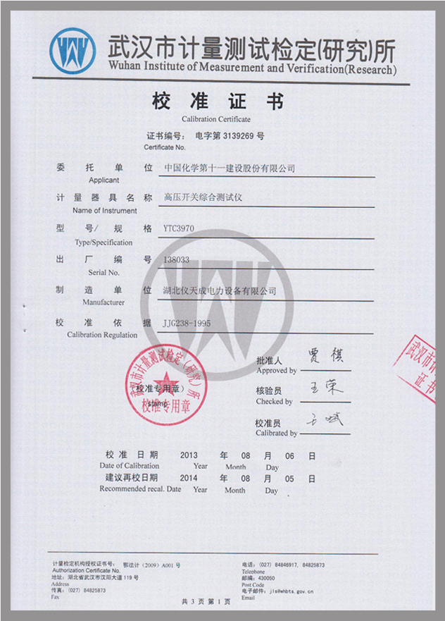 YTC3970高壓開(kāi)關(guān)動(dòng)特性測(cè)試儀鑒定證書(shū)